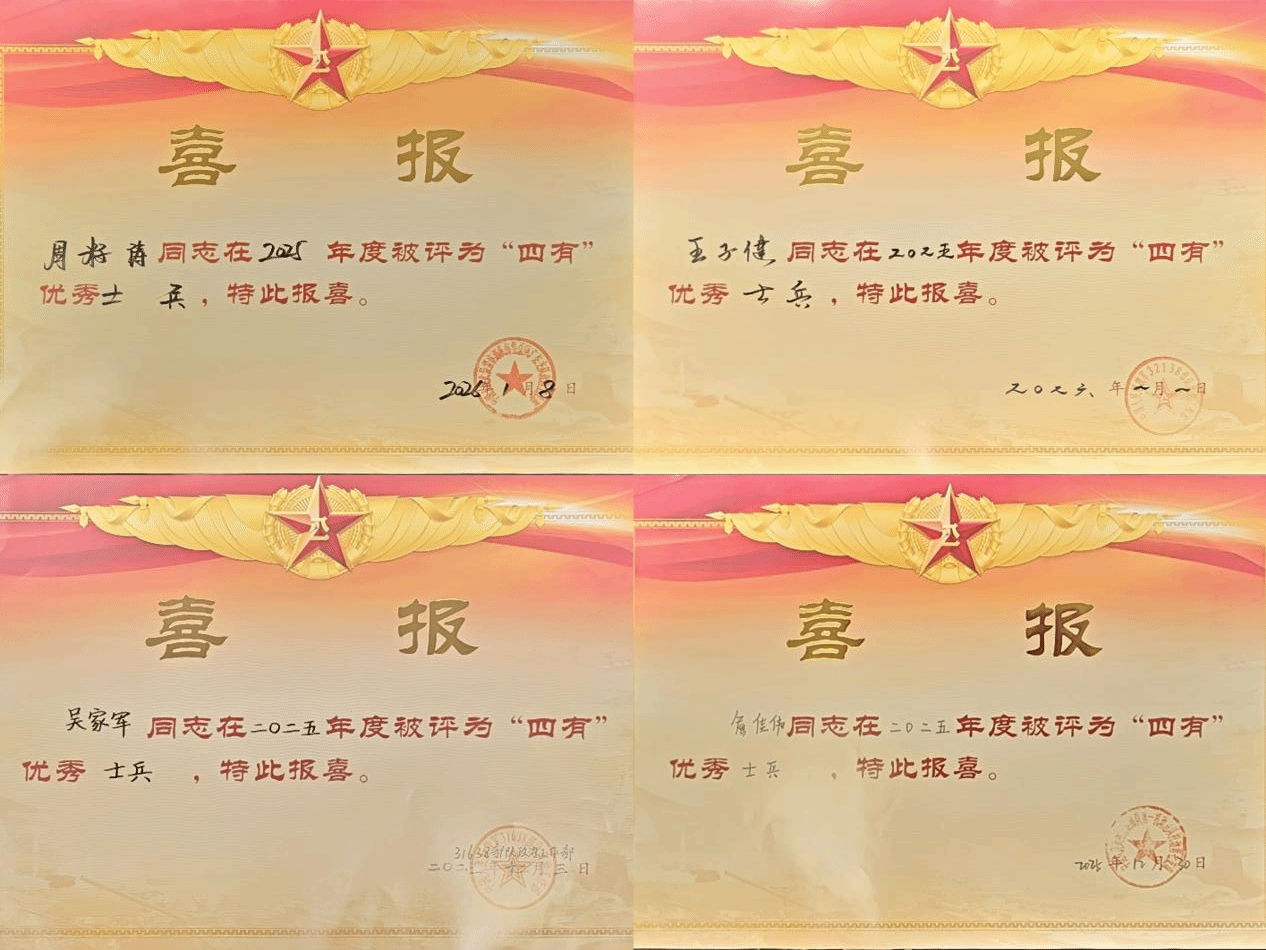 “四有优秀士兵”是指“有灵魂、有本事、有血性、有品德”,每年由部队评选,颁发由中央军委统一规范的奖状、证章、证书,并使用军队喜报专递信封寄发喜报的年度荣誉。多年来,我校党委始终高度重视大学生参军入伍工作,学校武装部在征兵政策宣传、优质兵源选拔、新兵入伍慰问、服役期间联络、退伍学生关爱等方面持续用力,越来越多入伍学子在部队脱颖而出,我校也逐步形成“入伍—立功—返校—反哺”的良性循环。